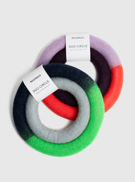 Duo Circle hundleksak är handgjord i Lettland och tillverkad i 100% ull. Den är utformad för olika typer av lekar och kul att kasta eller kampa med. Den täta filtade ullen färgad med säkra färgämnen hjälper dessutom till att hålla hundens tänder rena.