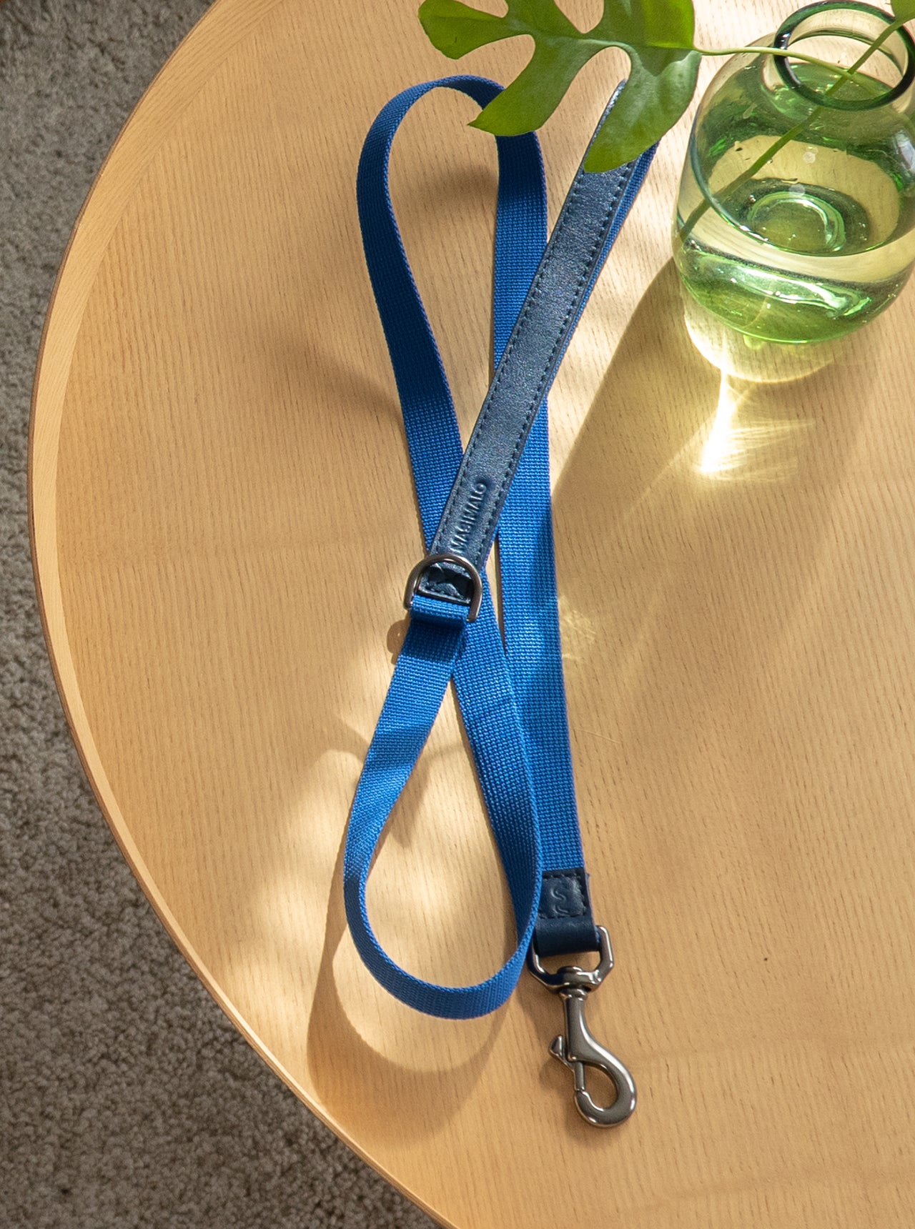 Blått funkar med allt, här kombineras klassiskt marinblått läder med lysande Grandala-blå för färgstarka promenader.
